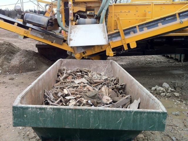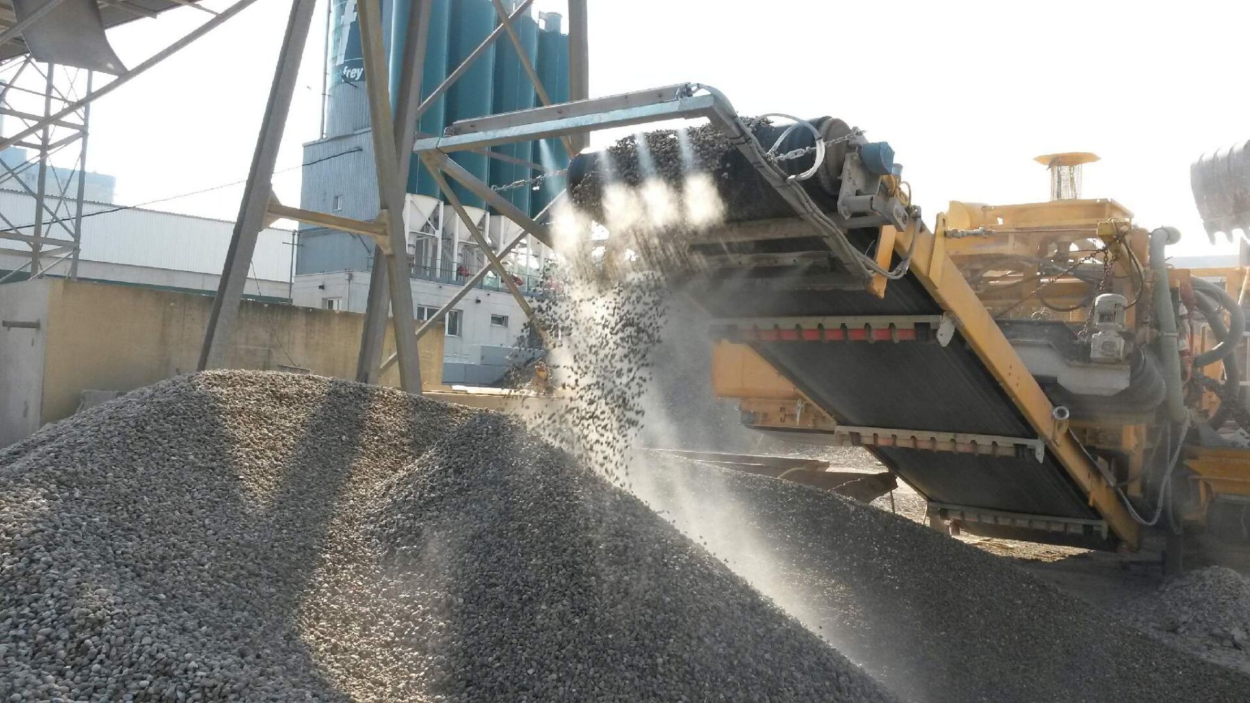 - Trennung des gebrochenen Kiesgemisches in 2 (oder 3) klassierte Fraktionen, wobei die Feinfraktion mit Seitenaustragsband und die Grobfraktion am Hauptaustragsband ausgetragen wird